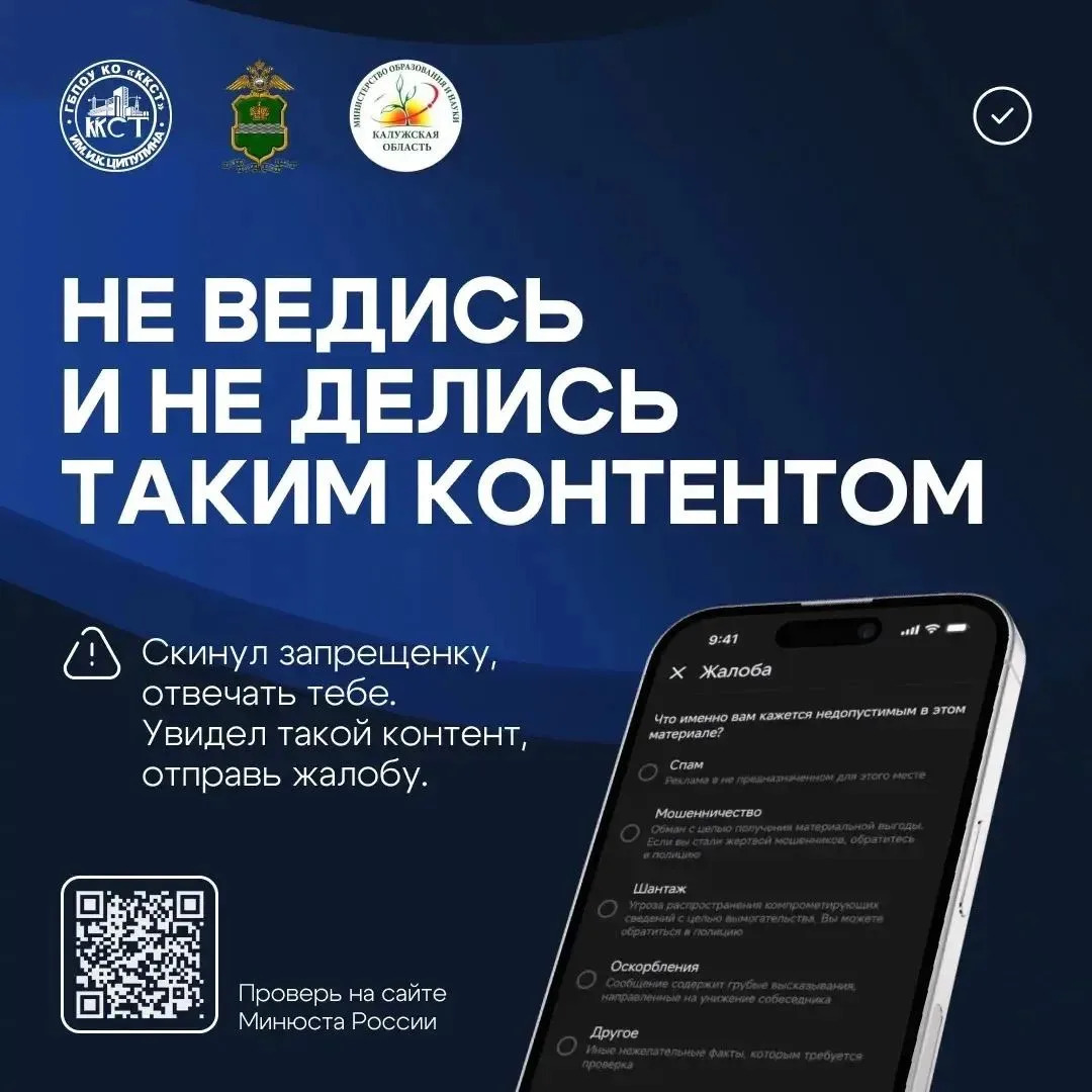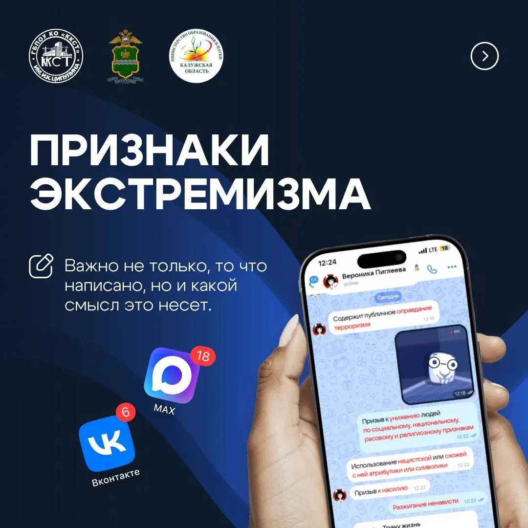 О признаках экстремистского контента рассказываем в карточках, созданных медиацентром Калужского коммунально-строительного техникума им. И.К. Ципулина совместно с Центром по противодействию экстремизму УМВД России по Калужской области и министерством образования и науки региона.